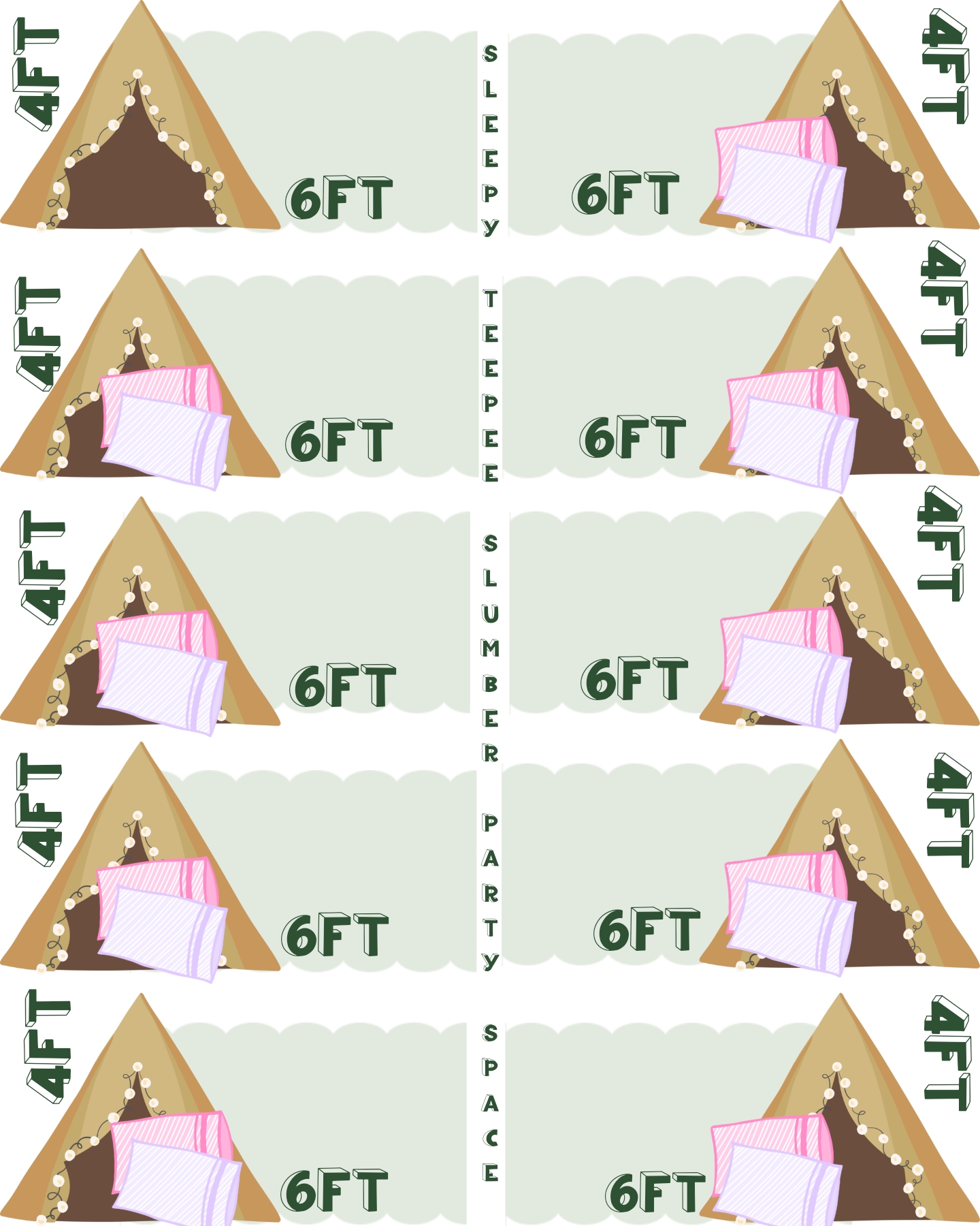 Each teepee setup needs a 4ft x 6ft space. Please measure accordingly and refer to this diagram: Sleepy Teepee Sizing Chart